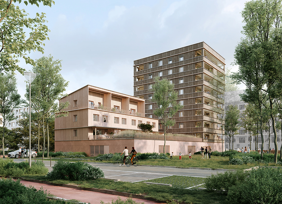 L’accès aux logements collectifs, en FOB (façade à ossature bois) se fait via une circulation verticale éclairée naturellement à tous les étages. Le bâtiment s’orne de loggias d’angles et d’une terrasse filante sur toute la façade Sud. En contraste au reste du projet, ses façades à ossature bois sont parées de bardage vertical bois prégrisé foncé.