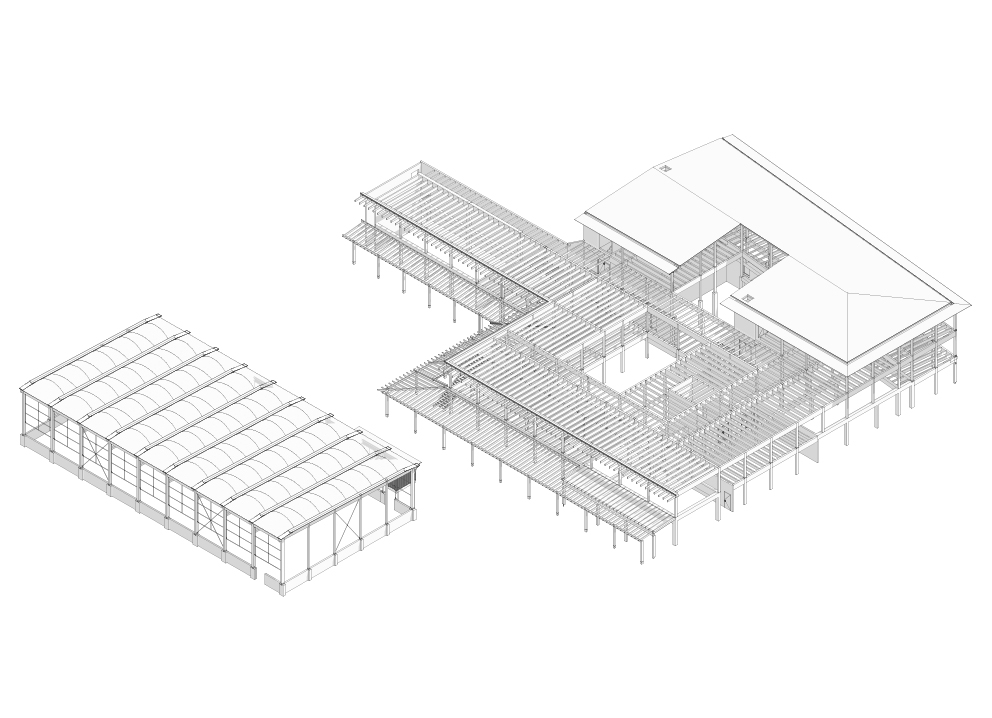 La volumétrie se veut compacte pour limiter les surfaces déperditives et réduire le cheminement des fluides. Les baies sont de dimensions raisonnables avec des dispositifs de protection passive. La structure poteau-poutre bois assure une flexibilité d’usage, les planchers connectés bois-béton réduisent le bilan carbone de l’ouvrage tout en apportant de l’inertie thermique. La façade à ossature bois (FOB) est rempli en bottes de paille, un gobetis/enduit à la chaux projeté à même la paille assure l’étanchéité à l’eau.
