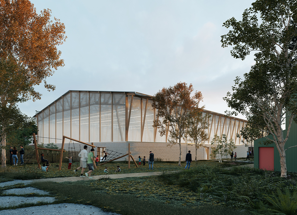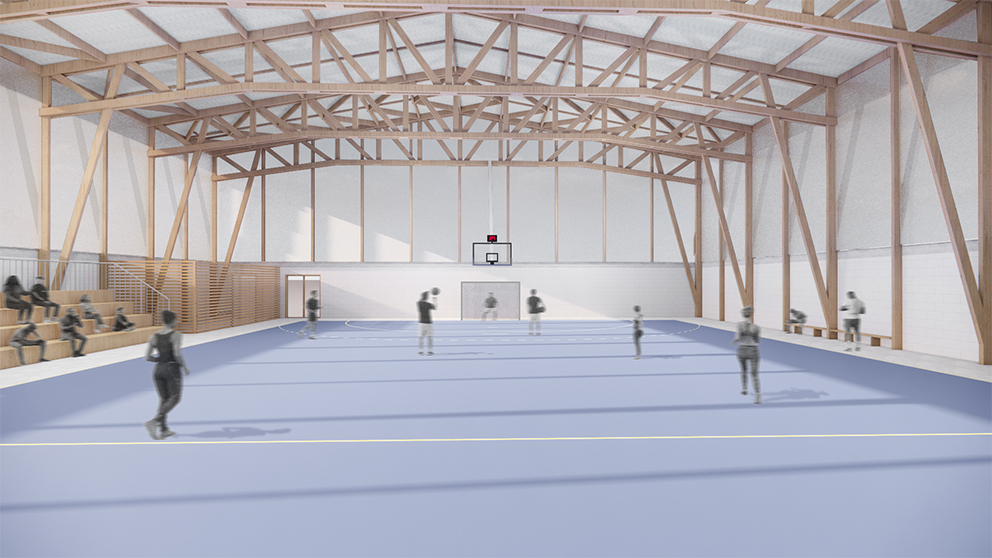 Un équipement Economique, Généreux, Elégant et Sobre énergétiquement, voilà les objectifs que nous nous sommes fixés en commençant ce projet. Il s’agit d’un équipement de grande envergure volumétrique, architecturalement très sobre avec une structure majoritairement en bois habillée de toile tendue pour la partie halle sportive qui lui confère un caractère très lumineux.