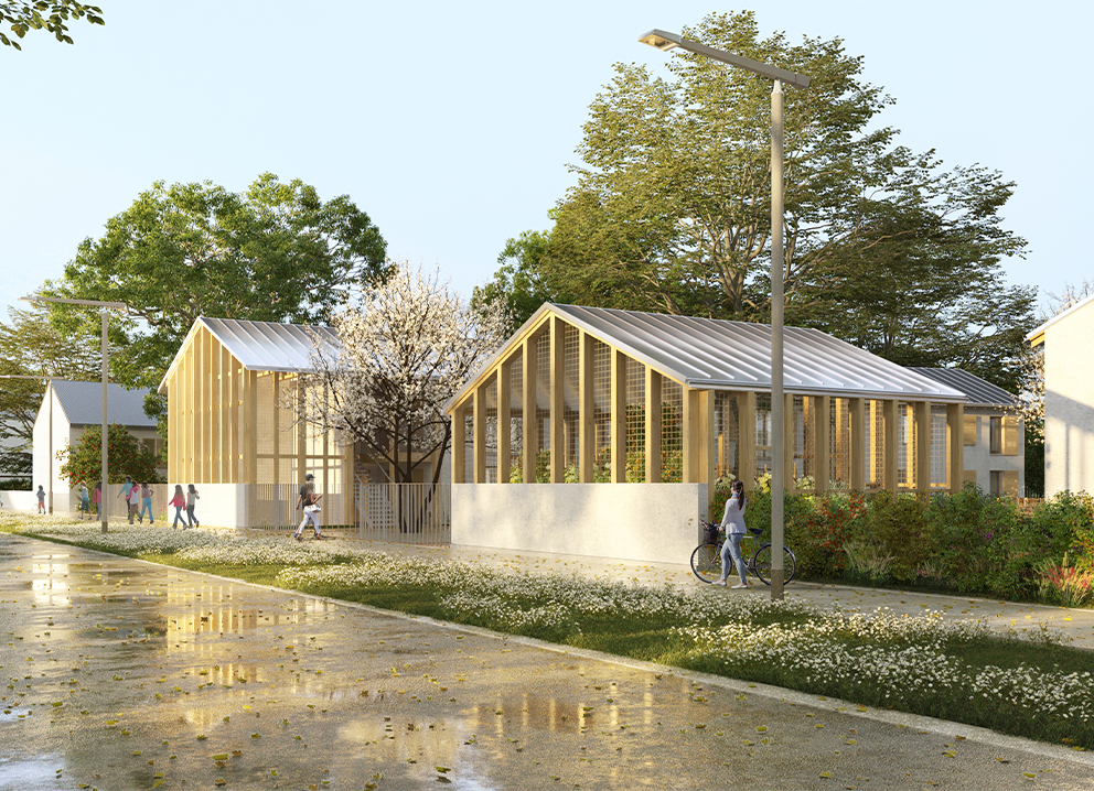 Fidèle à son inspiration agricole, notre proposition assume une simplicité de matériaux et de proportions. Les façades des bâtiments sont conçues sur un rythme calme et régulier de menuiseries de bois, accidenté par le sens d’ouverture des volets. Les auvents des maisons individuelles et les escaliers des bâtiments intermédiaires créent des transparences qui animent la façade. Au Sud, les loggias des bâtiments intermédiaires encadrées de poteaux bois sur toute la hauteur de la façade apportent un rythme et des profondeurs en décrochés.