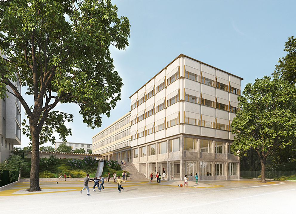 La première urbaine articule sur deux parvis, une salle associative et l’entrée des entités de l’école.
