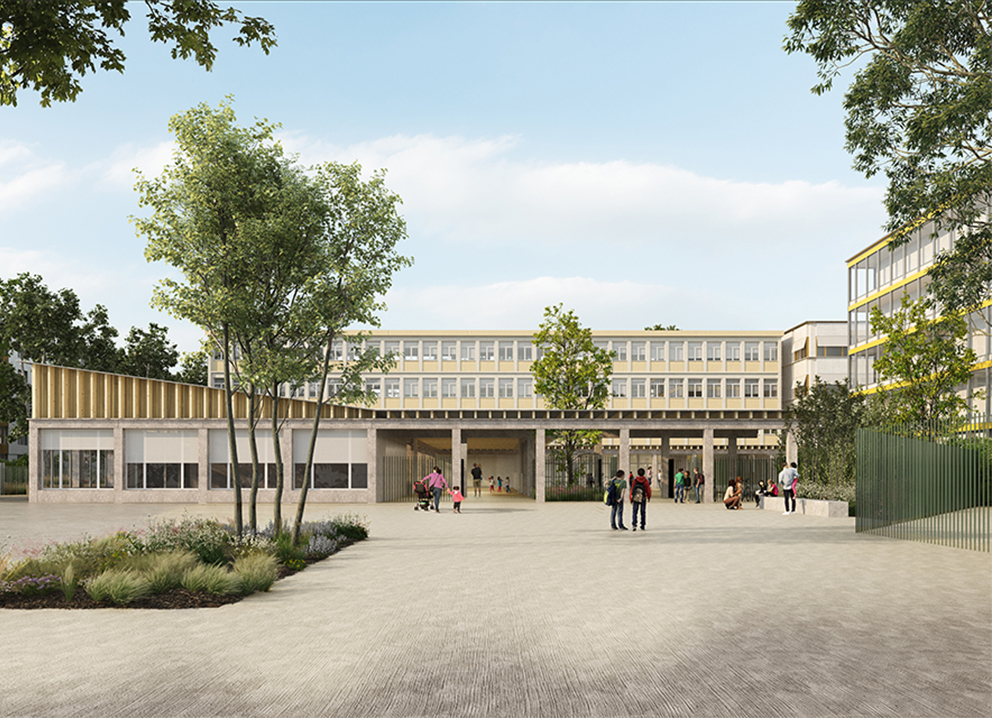 La troisième récréative ou paysagère agit comme le lien de l’ensemble : un préau connecteur, des arbres conservés, un talus planté entre cours haute et basse.