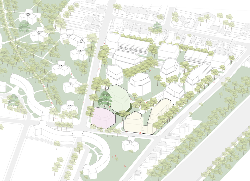 Dans le cadre d’une double mission urbaine et architecturale pour Est Ensemble et Seine-Saint-Denis Habitat sur le secteur démoli des Equerres Washington, nous proposons un plan urbain prolongeant le parc habité de Aillaud et préservant le patrimoine arboré du site. Des « plots », déhanchés, se logent dans les clairières : le corps à la hauteur des houppiers reprend le gabarit des tripodes de Aillaud, tandis que des attiques, discrets depuis le sol, s’élèvent au-dessus de la cime des arbres. Des « maisons en bande », découpées, s’étirent sur la frange pavillonnaire du site. Des « immeubles » alignés sur le chemin de Groslay clôturent le parc et adoptent eux aussi un attique. Les voitures sont refoulées à la périphérie du site, seule une chaussée de desserte est décalée pour adresser des logements côté pair et côté impair tandis que des sentes piétonnes traverseront le site.